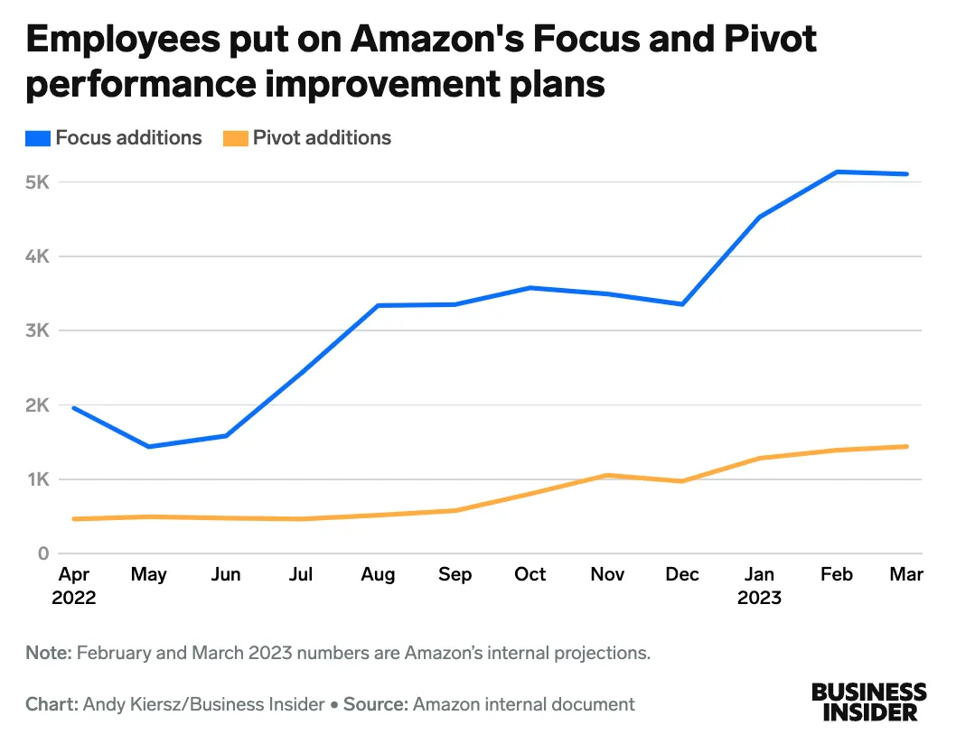 According to an official human-resources document from early 2023 obtained by Business Insider, the number of Amazon staff put on PIPs spiked from spring 2022 through early 2023. This document shows that in April 2022, Amazon put just under 2,000 staff into the Focus program, the initial stage of Amazon’s PIP process. By January 2023, those numbers spiked even higher, indicating a significant increase in PIP placements during this period.