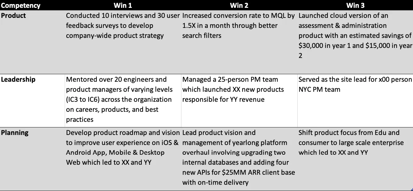 Ask your direct reports to categorize their wins by competencies in table format. It’ll serve as your cheat sheet when you’re looking for a specific example.