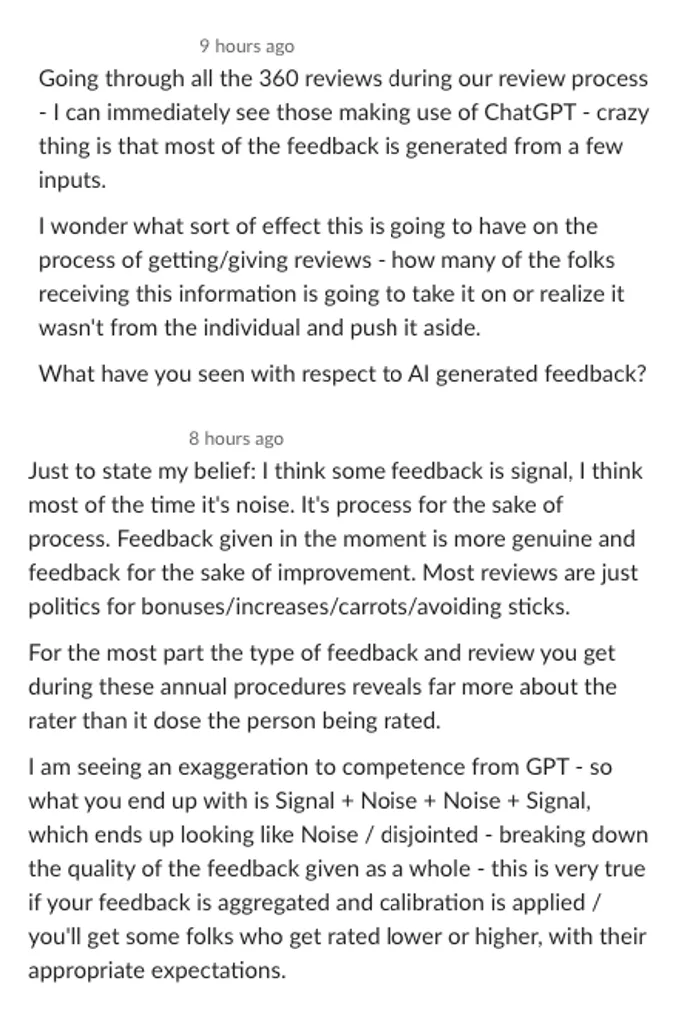 Unfortunately, the convenience of ChatGPT is being exploited by some employees who approach the performance review process with a checkbox mentality. Rather than investing time and thought into providing meaningful feedback, they use ChatGPT as a shortcut, resulting in generic and impersonal reviews that lack the depth and nuance required for a comprehensive performance evaluation.